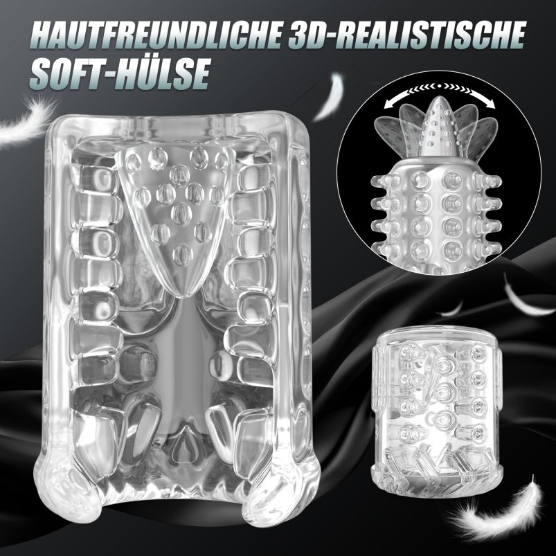 Gefertigt aus hochwertigem, transparentem Silikon, bietet das Innenleben nicht nur ein unglaublich weiches Hautgefühl („Hautfreundliche 3D-realistische Soft-Hülse“), sondern auch einen visuellen Reiz, da Sie die Stimulation beobachten können. Mit 9 verschiedenen Vibrations-, Saug- und Leckmodi finden Sie garantiert den Rhythmus, der Sie zum Höhepunkt bringt. Dank der IPX7-Zertifizierung ist dieser Blojob-Simulator vollständig wasserdicht und bereit für feuchte Abenteuer unter der Dusche oder in der Badewanne.