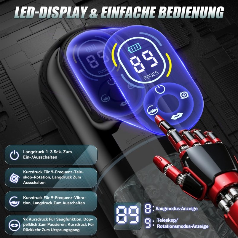 - 9 Stimulations-Modi: Eine Mischung aus Teleskop-Bewegungen (Auf und Ab), Vibration, Saugen und Lecken imitiert verschiedene Oral Sex Techniken.