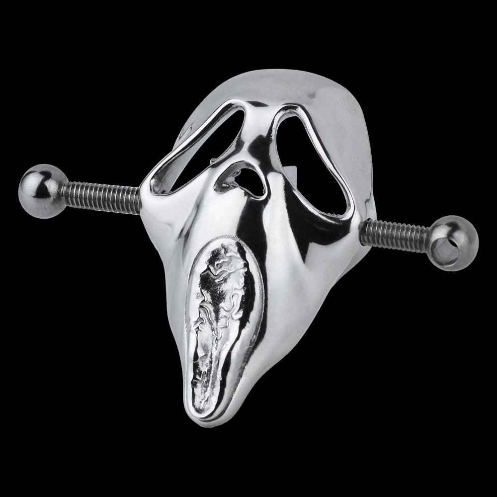 Dieses Produkt bleibt dem metallischen Stil treu: Die Klammer selbst ist in Form eines Schädels gestaltet, mit übertriebenen Augenhöhlen, markantem Mund und weiteren auffälligen Details. An den Seiten befinden sich oft schraubenartige Einstellstangen oder Metallkugeln zur Feinjustierung der Enge.